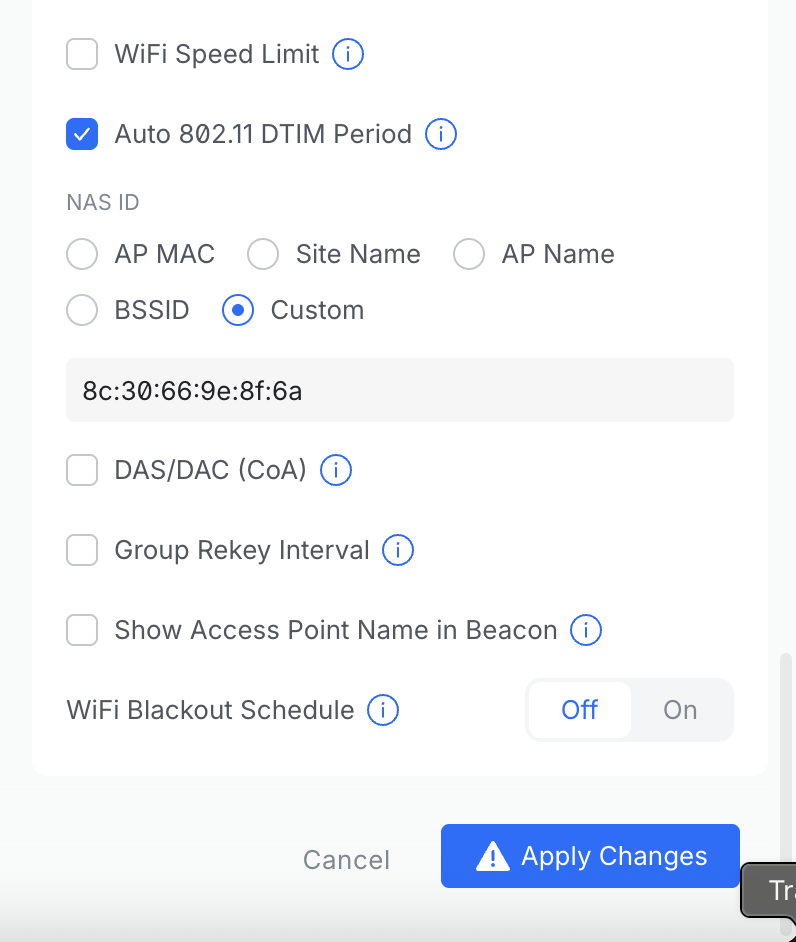 Each onboarded network requires a unique NAS-ID. For Ubiquiti networks, it is recommended to use the MAC address of the network controller as the NAS-ID.